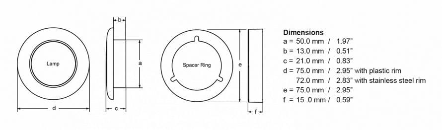 Lampy o zwiększonej jasności zawierają pierścień do montażu powierzchniowego z 3 śrubami ze stali nierdzewnej. Lampy ze stali nierdzewnej i z białymi obręczami zawierają białą ramkę dystansową, lampy z czarną obwódką czarną ramkę dystansową.