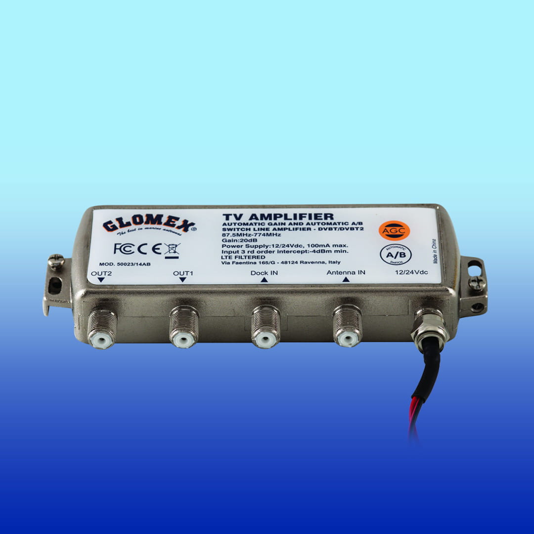 Gdy zacumujesz jacht i dok posiada antenę telewizyjną, możesz łatwo podłączyć pokładowy system telewizyjny do anteny telewizyjnej doku. Kiedy wzmacniacz 50023/14AB znajdzie sygnał TV doku, automatycznie przełącza odbiór sygnału z anteny Glomex TV na antenę TV w doku. Co więcej, ten nowy wzmacniacz, w porównaniu do poprzedniego, posiada następujące kluczowe cechy: