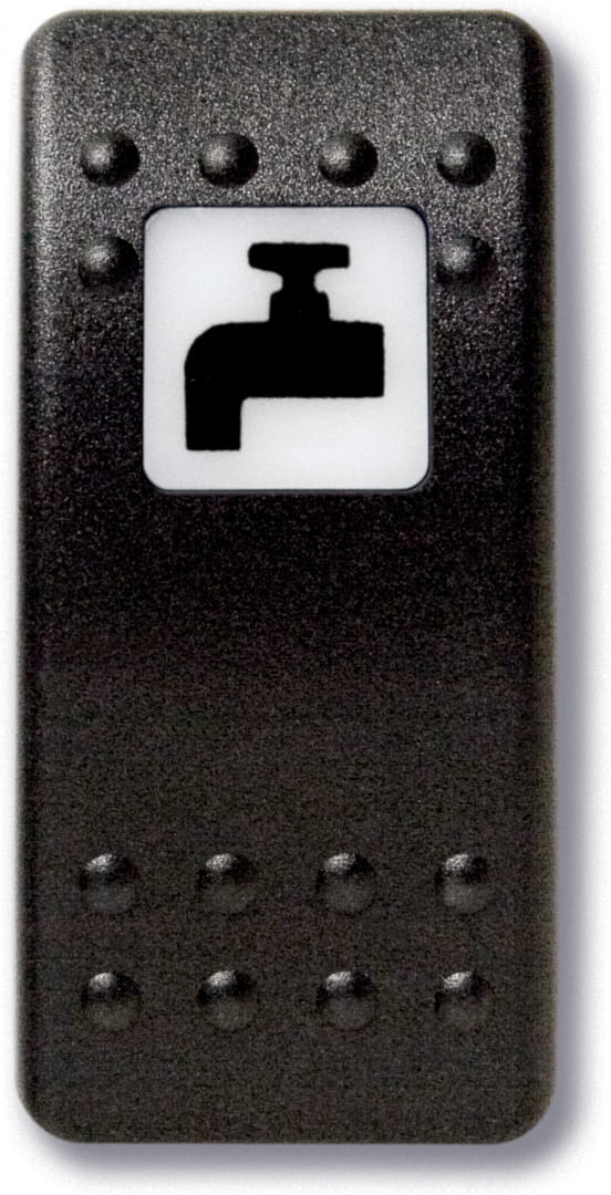 Ten odporny na warunki atmosferyczne przycisk sterujący firmy Mastervolt, wykonany z kompozytu poliwęglanowego, można łatwo wpiąć w wodoodporny przełącznik podstawy. W magazynie znajduje się ponad 60 różnych piktogramów/symboli. Dostępny jest również klawisz do ponownego usunięcia przycisku sterującego (klawisz usuwania przycisku sterującego).