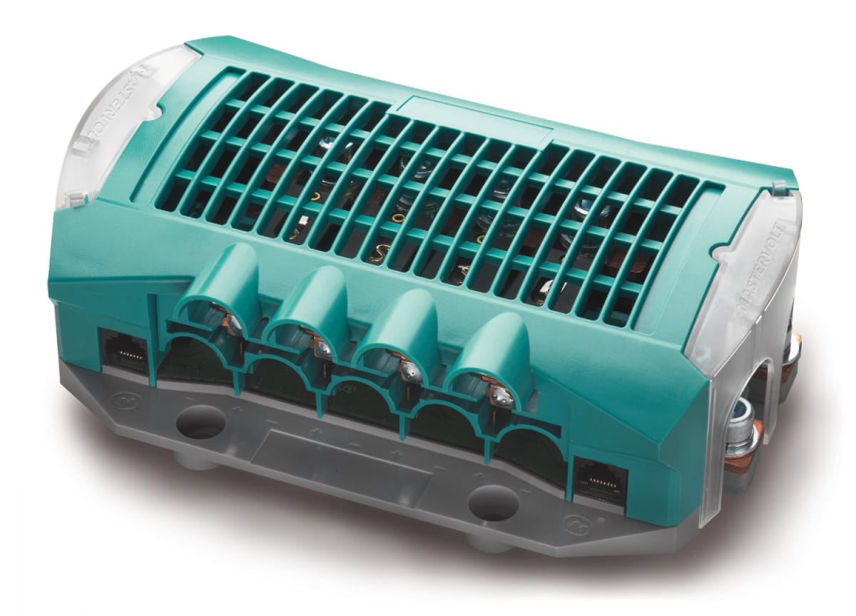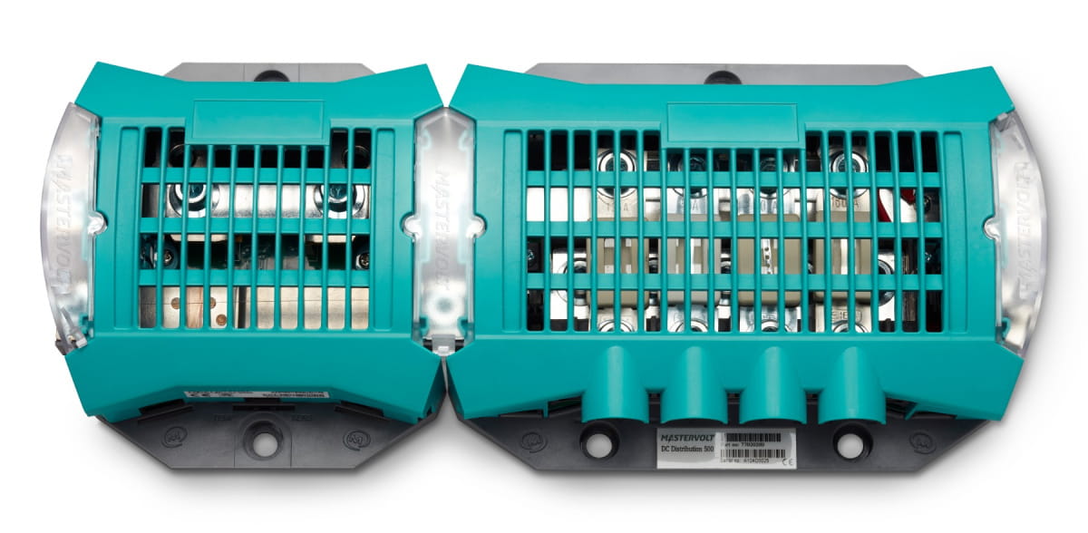 DC Distribution 500 to najmniejszy dostępny model dystrybucji. Łączy do czterech urządzeń prądu stałego, takich jak ładowarka akumulatorów, inwerter, alternatory i panele słoneczne. Za pomocą kabla plug & play można go łatwo podłączyć do sieci MasterBus. Panel EasyView nadaje wszystkim bezpiecznikom nazwy logiczne, na przykład odnoszące się do podłączonego sprzętu, aby zapewnić otrzymywanie zrozumiałych powiadomień o błędach (na przykład: uszkodzenie bezpiecznika ładowarki).