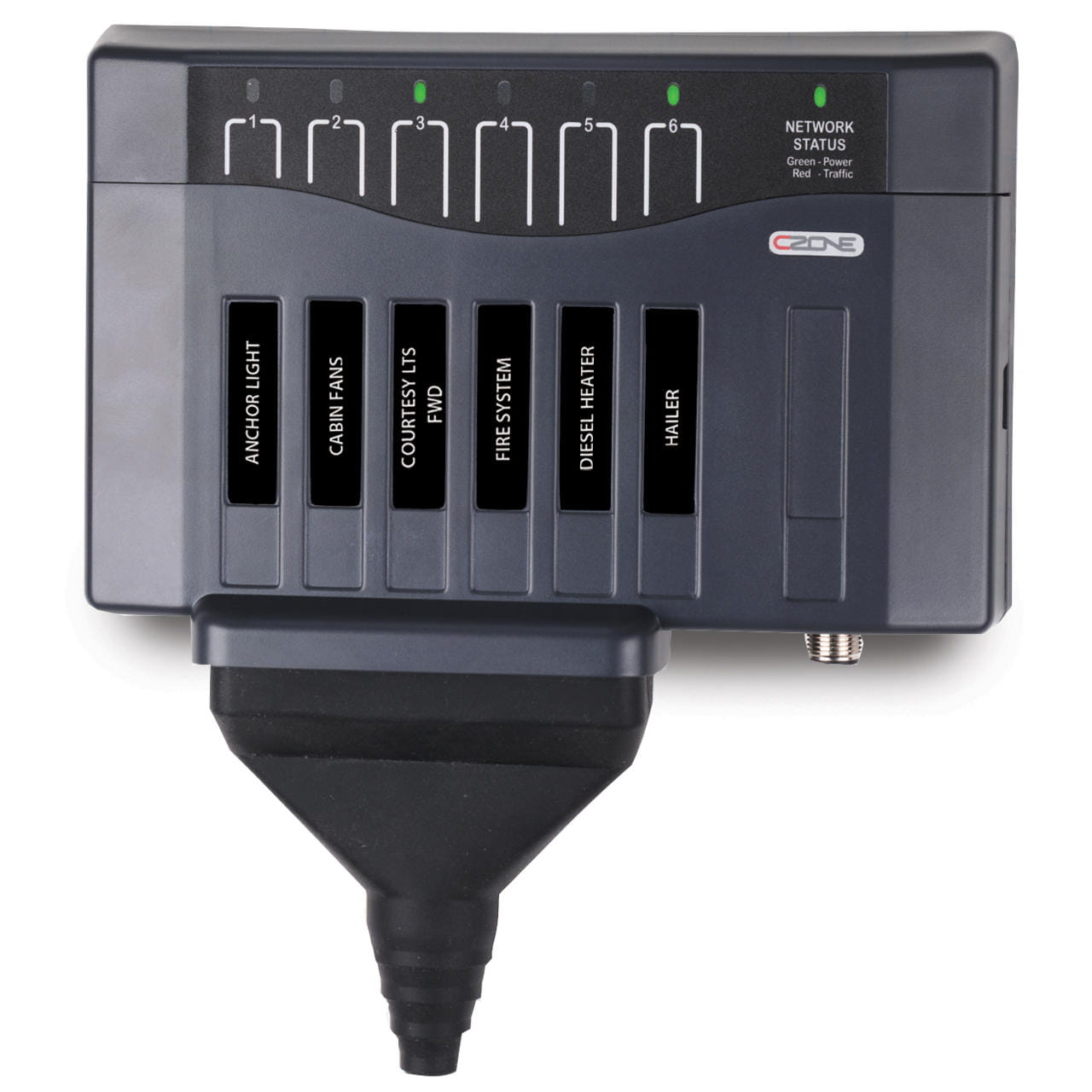Interfejs wyjściowy stanowi inteligentny zamiennik tradycyjnych paneli wyłączników i bezpieczników. Posiada sześć wytrzymałych kanałów wyjściowych o dużej mocy, które zapewniają zasilanie, sterowanie i bezpieczniki obwodu, a także integrują wiele innych wbudowanych funkcji, takich jak timery i ściemniacze. Podłączenie do urządzenia jest proste: duża 6-stykowa wtyczka umożliwia podłączenie kabli do 16 mm2 (6AWG) lub wielu mniejszych przewodów. Nie ma potrzeby przenoszenia specjalistycznych końcówek do zaciskania i drogich narzędzi do zaciskania końcówek do CZone, wystarczy śrubokręt z ostrzem. Elastyczny but ochronny zapewnia ochronę połączeń przed trudnymi warunkami środowiskowymi.