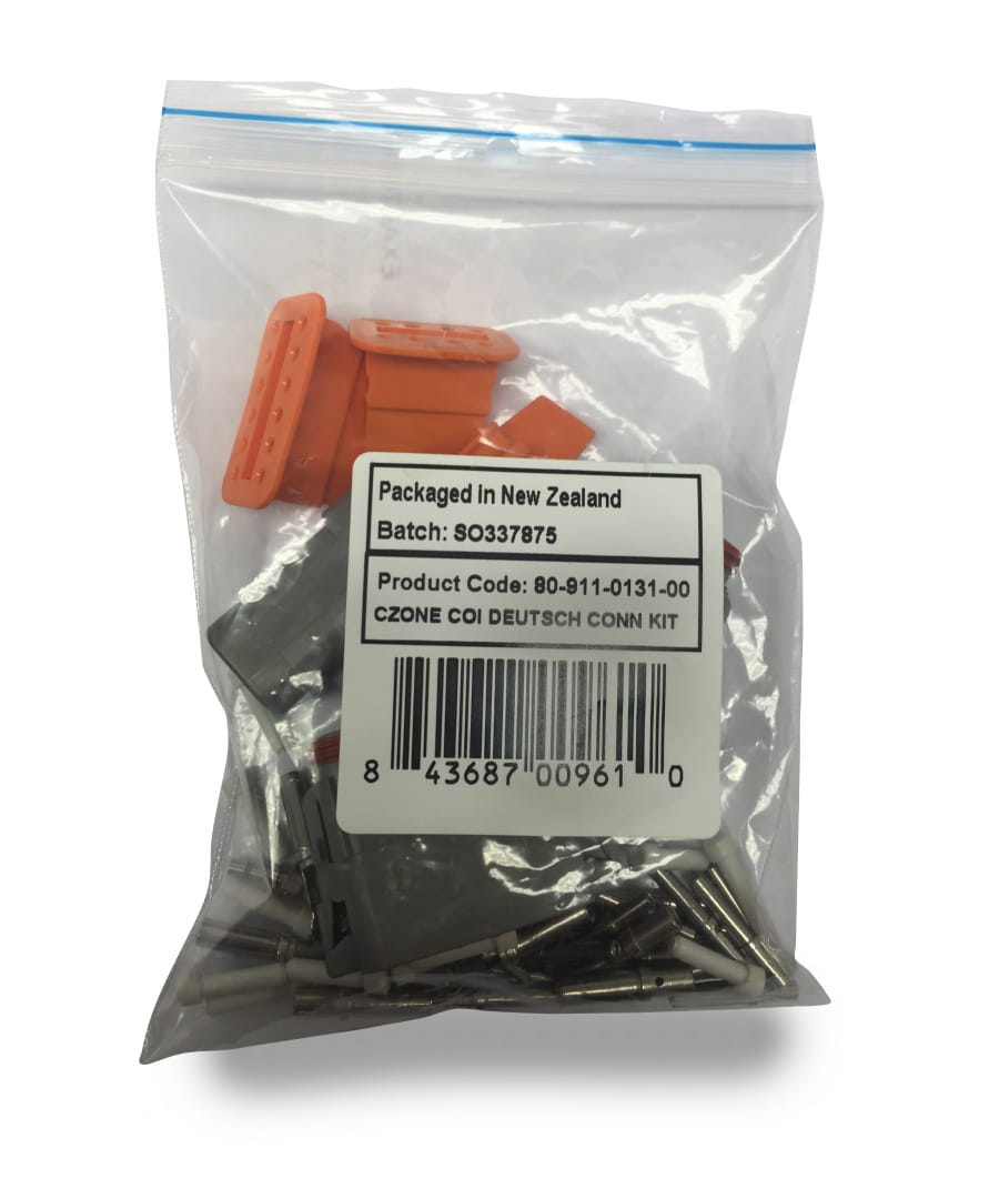 Zestaw złączy Deutsch zawiera złącza Deutch, kliny blokujące i styki niezbędne do podłączenia gołych przewodów do wysokich wyjść Control1/Combination Output Interface (DTP 4-drożny), niskich wyjść (DT 12-drożny) i wejść monitorujących (DT 8-drożny).