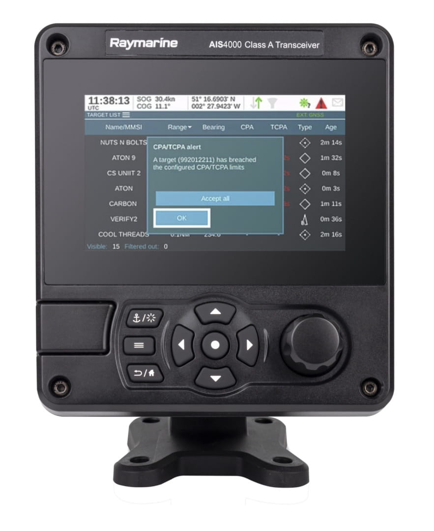 Przeznaczony dla statków komercyjnych, luksusowych jachtów i żeglugi pełnomorskiej SOLAS, nadajnik/odbiornik AIS4000 Systemu Automatycznej Identyfikacji (AIS) zapewnia niezawodne możliwości sieci AIS klasy A i został zaprojektowany tak, by wytrzymać trudne warunki pogodowe, wstrząsy i wibracje dowolnej klasy statku.