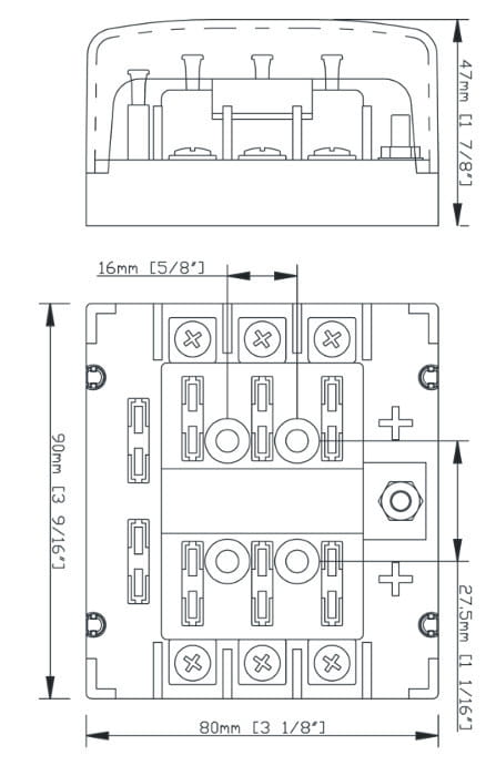 - Gniazdo bezpiecznikowe ATC: 80 x 90 x 47 mm (3,1 x 3,6 x 1,9 cala)