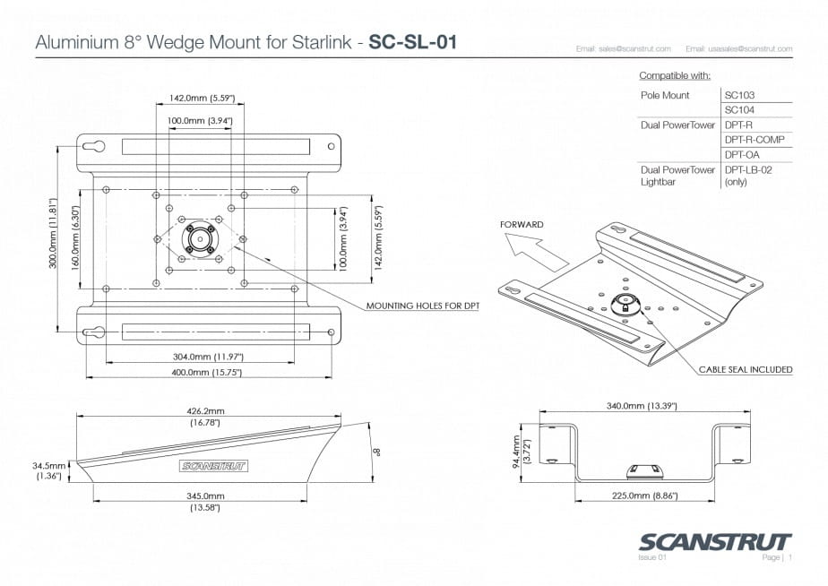 Aluminiowy uchwyt klinowy Scanstrut 8° dla modelu Starlink High-Performance został zaprojektowany specjalnie z myślą o środowisku morskim. Ten wszechstronny klin może służyć jako samodzielna opcja do montażu Starlink bezpośrednio na dachu lub pokładzie jachtu. Dodatkowo działa jako płyta adaptera, płynnie integrując się z popularną gamą Modular Dual PowerTower, dzięki czemu idealnie nadaje się do instalacji wieloelektronicznych na jachtach motorowych. Może być również używany jako płyta górna w połączeniu z gamą uchwytów na maszt SC100, zaprojektowaną specjalnie do montażu na pawęży na jachtch żaglowych, zapewniając, że sprzęt Starlink zostanie podniesiony do optymalnej pozycji, optymalizując jednocześnie przestrzeń na pokładzie.