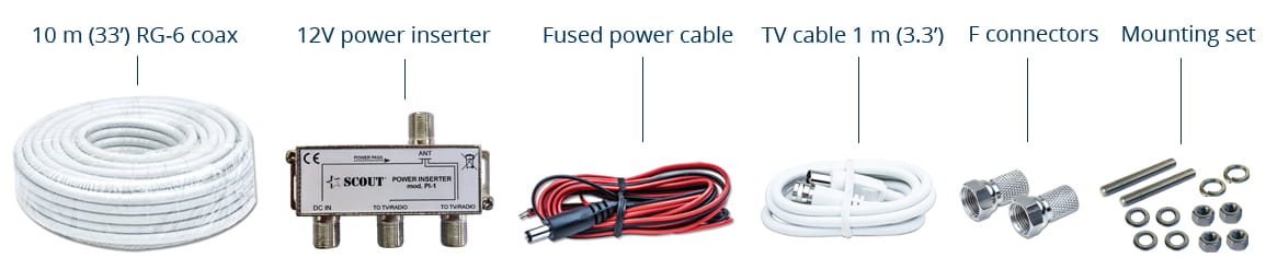 Dostarczana z przełącznikiem zasilania ze zintegrowanym zabezpieczeniem przed odwrotną polaryzacją, które umożliwia jednoczesne podłączenie dwóch urządzeń, np. 2x TV lub 1x TV i 1x radio FM. Antenę można zamontować bezpośrednio na pokładzie lub na stopkach antenowych z gwintem 1 "x14".