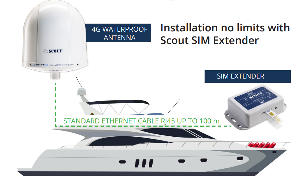 Dzięki przedłużaczowi SIM, bez względu na to, gdzie znajduje się kopuła, połączenie jest gwarantowane przez standardowy kabel Ethernet RJ45, który może sięgać do 100 metrów bez utraty sygnału. Ponadto kopuła oferuje dodatkowy kabel LAN Ethernet do skonfigurowania sieci przewodowej na łodzi (zalecane dla większych łodzi i łodzi aluminiowych).