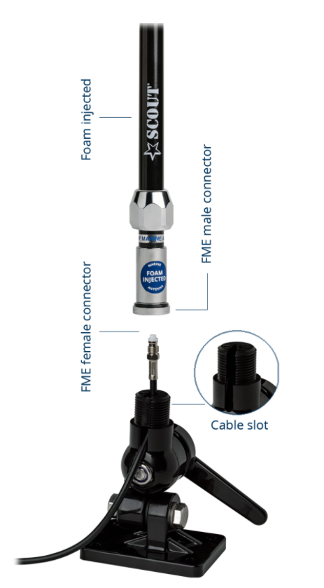 QuickFit to nowa linia gotowych do instalacji anten morskich Scout, które nie wymagają złączy RF, są łatwe do usunięcia i całkowicie wodoodporne dzięki oryginalnej technologii wtrysku pianki Scout.