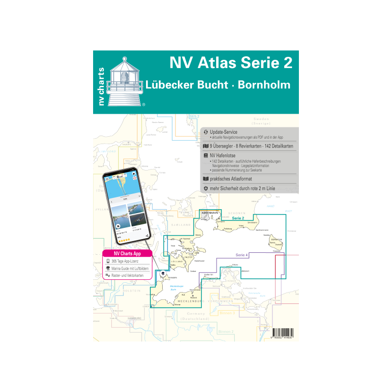 NV Charts Serie 2 to kompletny atlas dla żeglarzy przemierzających wybrzeża Niemiec, Danii i Polski – od Zatoki Lubeckiej, przez Bornholm, aż po Kopenhagę. Zawiera szczegółowe dane nawigacyjne, porty, latarnie morskie, znaki, głębokości i ograniczenia.