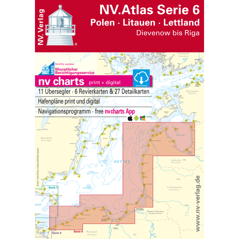 Atlas map NV Charts Serie 6 obejmuje południowo-wschodnie wybrzeże Bałtyku. Od polskiego Dziwnowa, przez Zatokę Gdańską, Kaliningrad, litewską Kłajpedę, aż po Rygę na Łotwie i granicę z Estonią. To szczegółowe i praktyczne narzędzie dla żeglarzy, którzy planują rejsy w mniej uczęszczanych, a zarazem niezwykle malowniczych rejonach Bałtyku.