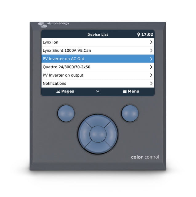 Color Control GX stanowi centrum komunikacyjne całej instalacji. Pozwala szybko przeglądać bieżące informacje oraz kontrolować wszystkie podłączone do niego produkty. Możliwość dostępu do Color Control GX za pomocą darmowego portalu internetowego Victron Remote Management (VRM) gwarantuje pełną kontrolę nad systemem z prawie każdego miejsca na świecie.