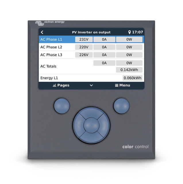 Panel Color Control GX zarządza systemami magazynowania energii. Utrzymuje akumulatory awaryjne w stanie całkowicie naładowanym, włącza zasilanie podczas przerw w dostawie energii elektrycznej oraz przekierowuje nadmiar mocy z ogniw fotowoltaicznych jako energię na własny użytek, przez co generuje oszczędności. Przykłady oraz bardziej szczegółowe informacje można znaleźć w Podręcznik dla systemów ESS.