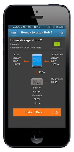 Wystarczy jedno dotknięcie, aby w Color Control GX natychmiast przejrzeć stan całego systemu: stan naładowania akumulatorów, aktualne zużycie energii, moc pozyskiwaną z instalacji PV, moc dostarczaną z sieci/generatora.