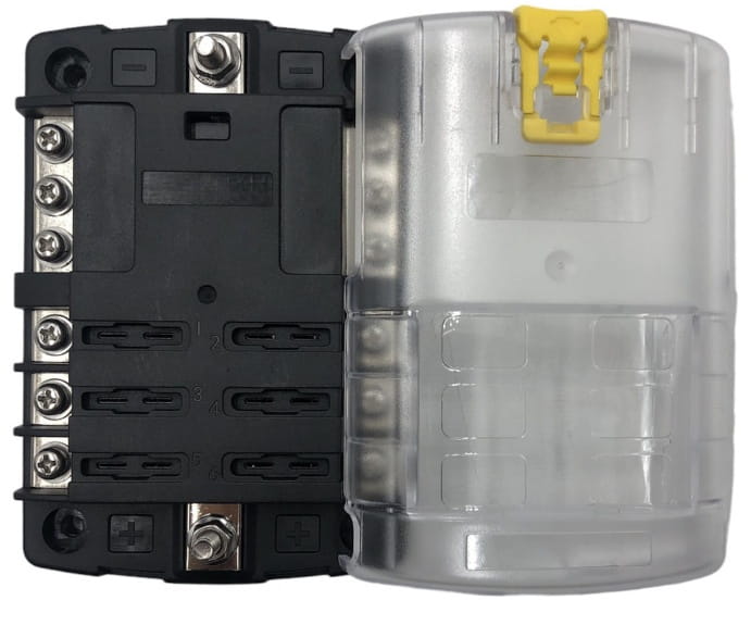 Szyna rozdzielcza dodatnia z zaciskiem M5. Może być stosowana w obwodach 24-godzinnych, zawiera łatwy do otwarcia zatrzask przyciskowy zapewniający łatwy dostęp do bezpieczników, miejsce do przechowywania dwóch zapasowych bezpieczników. Format Etykiety do identyfikacji obwodów. Szyny i zaciski bezpiecznikowe z miedzi cynowanej. Akceptuje zaciski pierścieniowe lub widełkowe. Akceptuje szybko działające bezpieczniki nożowe. Bezpieczniki sprzedawane oddzielnie.