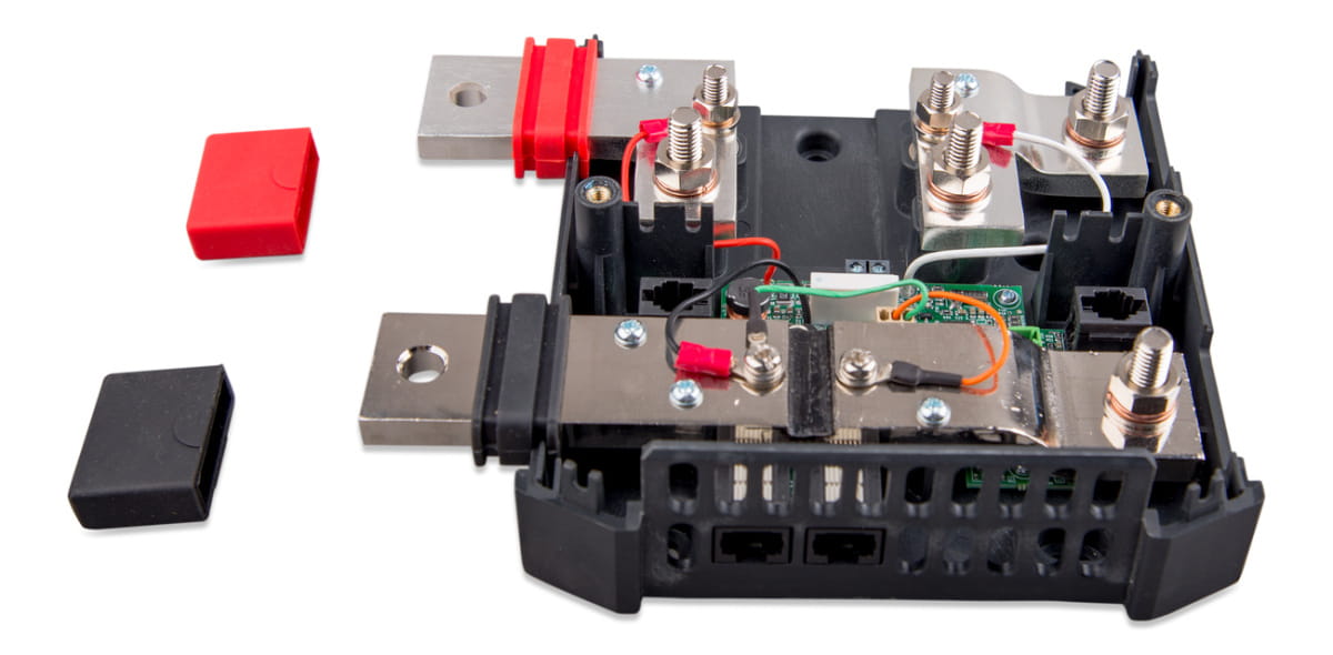 Lynx Shunt VE.Can zawiera dodatnią i ujemną szynę zbiorczą, monitor baterii i uchwyt bezpiecznika dla głównego bezpiecznika systemu. Stanowi część systemu Lynx Distribution.