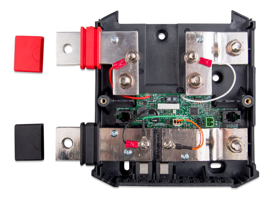 • Lynx Shunt VE.Can - Szyna dodatnia z miejscem na główny bezpiecznik systemowy oraz szyna ujemna z bocznikiem do monitorowania akumulatora. Posiada komunikację VE.Can do monitorowania i konfiguracji z urządzeniem GX.