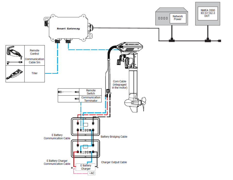 Może być podłączony do silników zaburtowych ePropulsion, przepustnic, akumulatorów serii E i urządzeń NMEA 2000. Zasilanie jest dostarczane przez interfejs NMEA, więc nie jest wymagane żadne dodatkowe źródło zasilania.