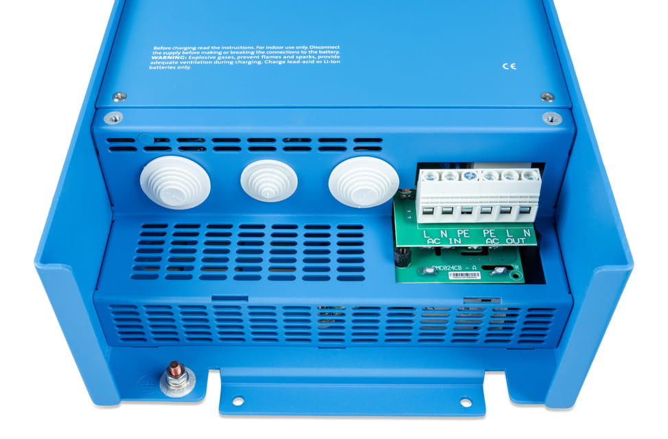 Drugie wyjście jest pod napięciem tylko wtedy, gdy na wejściu MultiPlus jest dostępny prąd zmienny. Do tego wyjścia można podłączyć odbiorniki, które nie powinny rozładowywać akumulatora, jak na przykład podgrzewacz wody (drugie wyjście dostępne w modelach o mocy 3 kVA i większej).