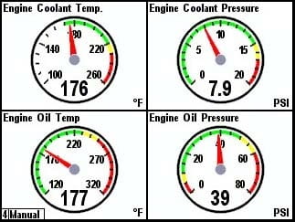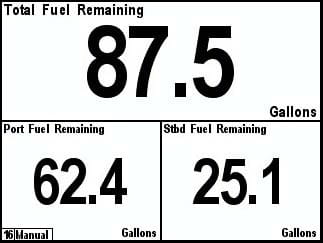 - Monitor silnika (ciśnienie doładowania, godziny, ciśnienie płynu chłodzącego, temperatura płynu chłodzącego, temperatura spalin, ciśnienie paliwa, zużycie paliwa, temperatura oleju, obrotomierz, pochylenie/trymowanie, napięcie, oszczędność paliwa, zużycie paliwa, obciążenie procentowe, moment obrotowy procentowy, przebieg Zużyte paliwo, wskaźniki ostrzegawcze)