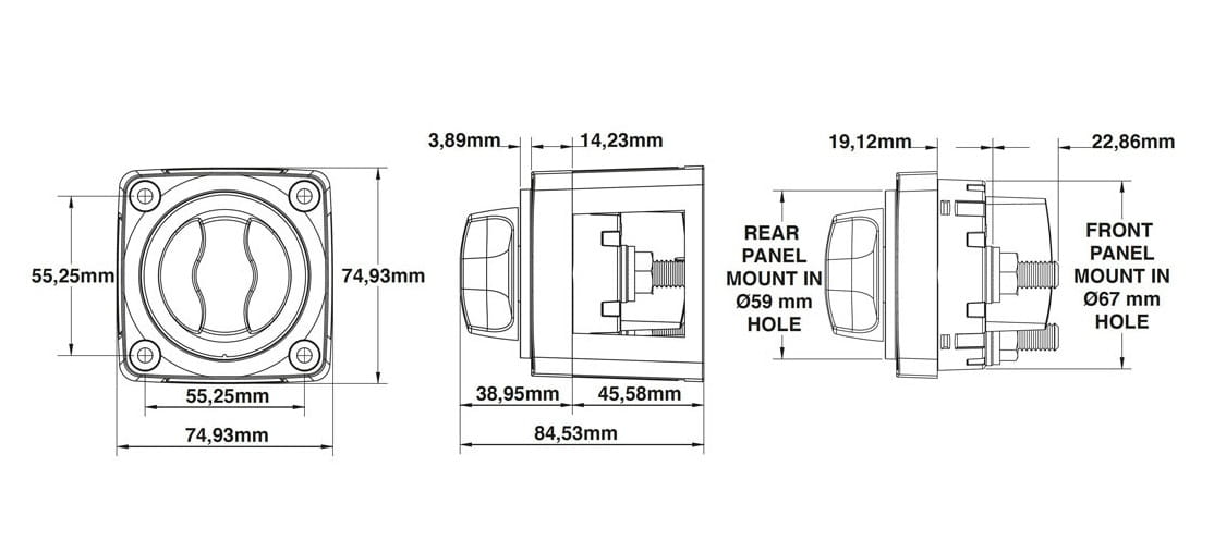 Jednocześnie przełącza przewody dodatnie i ujemne. Wykonany ze wzmocnionego poliwęglanu. Konstrukcja obudowy umożliwia montaż na powierzchni, z tyłu lub na panelu przednim. Wyjmowany klucz. Cynowane miedziane kołki zapewniające maksymalną przewodność i odporność na korozję.