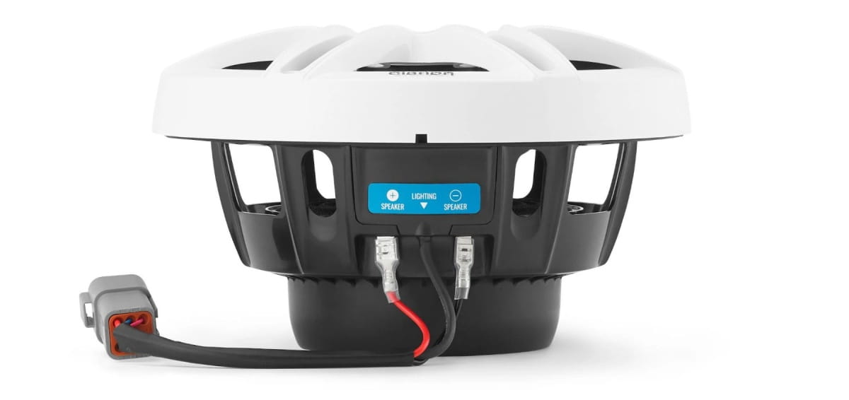7,7-calowe (196mm) koncentryczne głośniki morskie Premium z wbudowanym podświetleniem RGB, moc wyjściowa 60 W RMS. Głośnik wysokotonowy z kopułką jedwabną 1 cala (25 mm). W zestawie białe i szare sportowe maskownice.