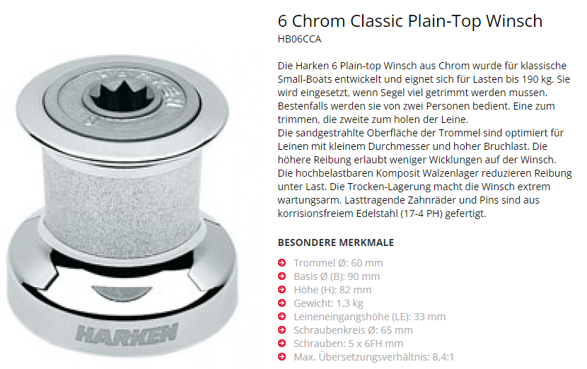Chromowany kabestan Harken 6 Plain-Top został opracowany z myślą o klasycznych małych łódkach i nadaje się do obciążeń do 190 kg. Jest używany, gdy żagle muszą być często trymowane. Idealnym rozwiązaniem jest obsługa przez dwie osoby. Jedna do trymowania, druga do zwijania linki. Piaskowana powierzchnia bębna jest zoptymalizowana dla lin o małej średnicy i dużej sile zrywającej. Wyższe tarcie pozwala na mniejszą liczbę zwojów na kabestanie. Wytrzymałe kompozytowe łożyska wałeczkowe zmniejszają tarcie pod obciążeniem. Suche łożyska sprawiają, że kabestan jest wyjątkowo łatwy w utrzymaniu. Obciążalne koła zębate i sworznie wykonane są z odpornej na korozję stali nierdzewnej (17-4 PH).
