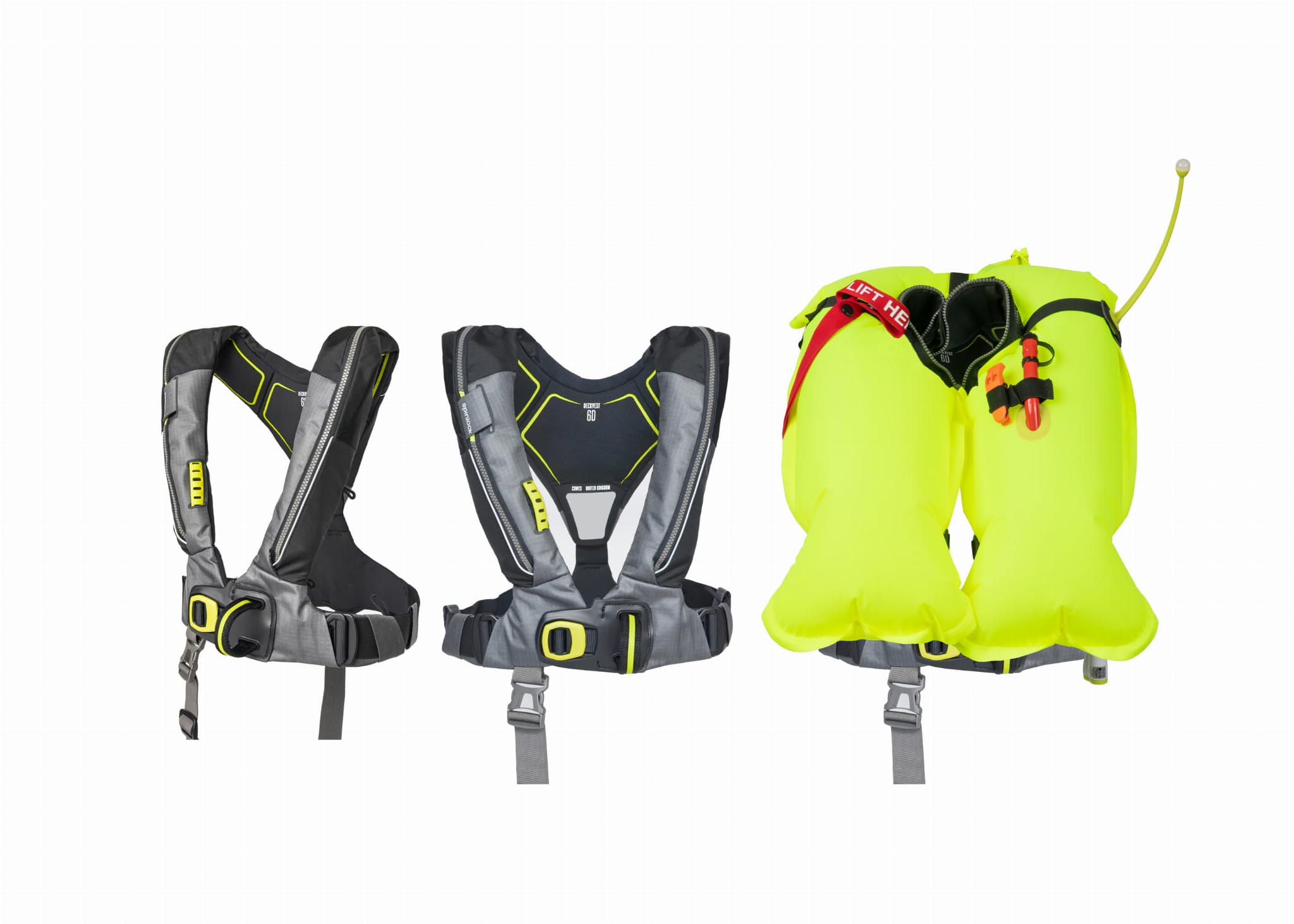 W pełni funkcjonalna, lekka kamizelka ratunkowa z uchwytem uprzęży, automatycznie pompowana.