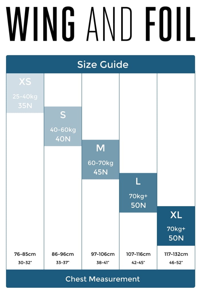 Pięć rozmiarów: XS, S, M, L, XL (wyporność 35-50N)