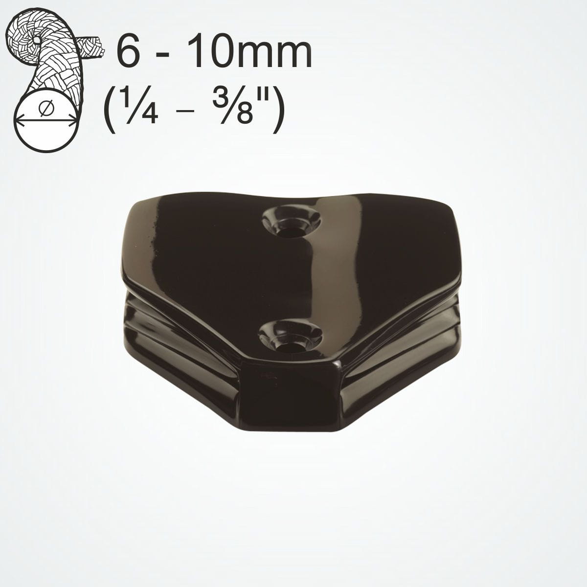 Niskoprofilowy zacisk z czarnego nylonu. Clamcleat® CL202 może utrzymać dwie liny. Alternatywnie, pojedyncza lina może być przymocowana po obu stronach. Może być montowany na powierzchniach poziomych lub pionowych.