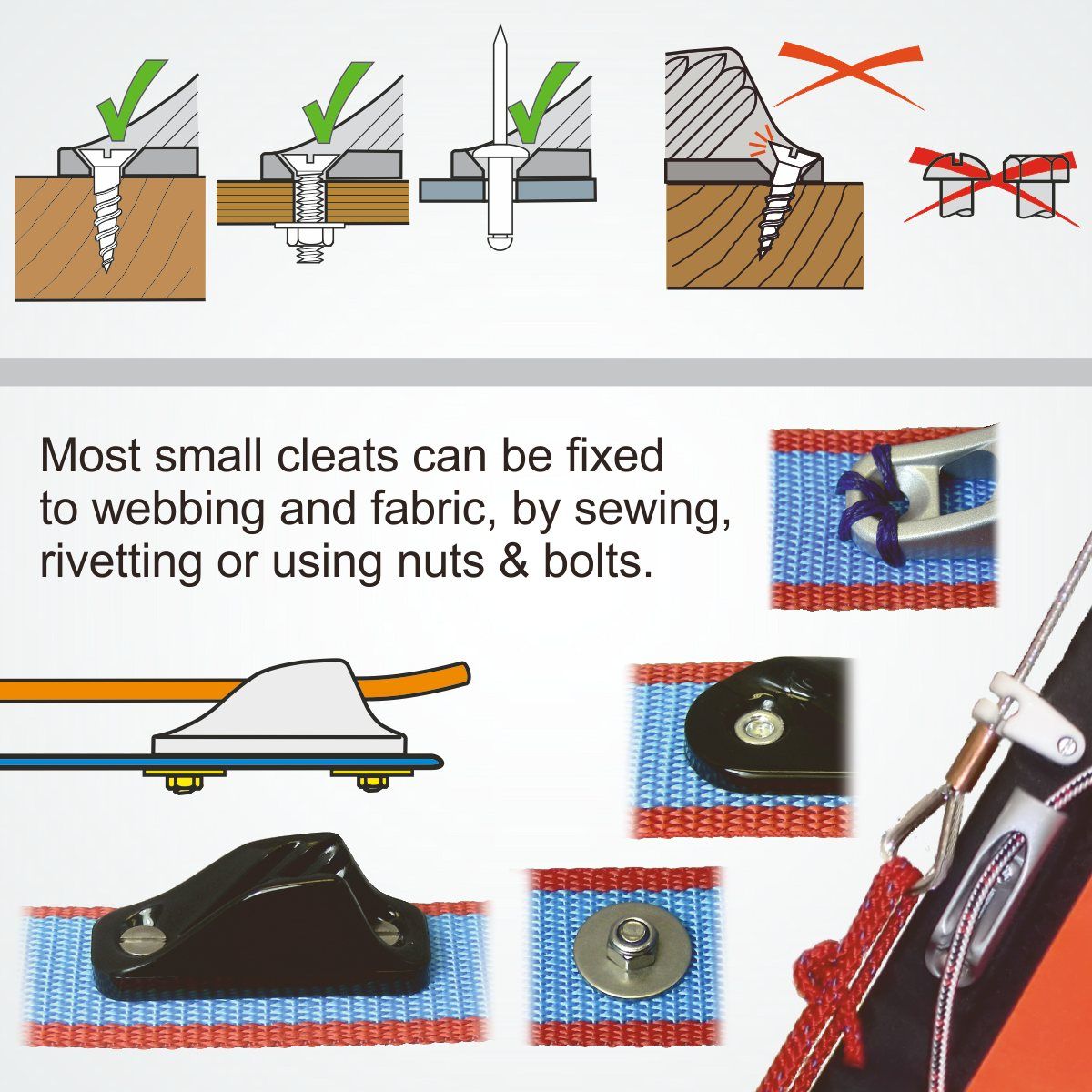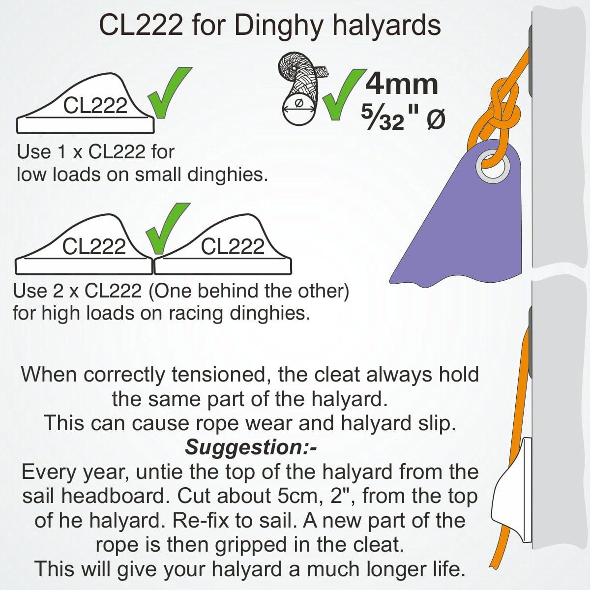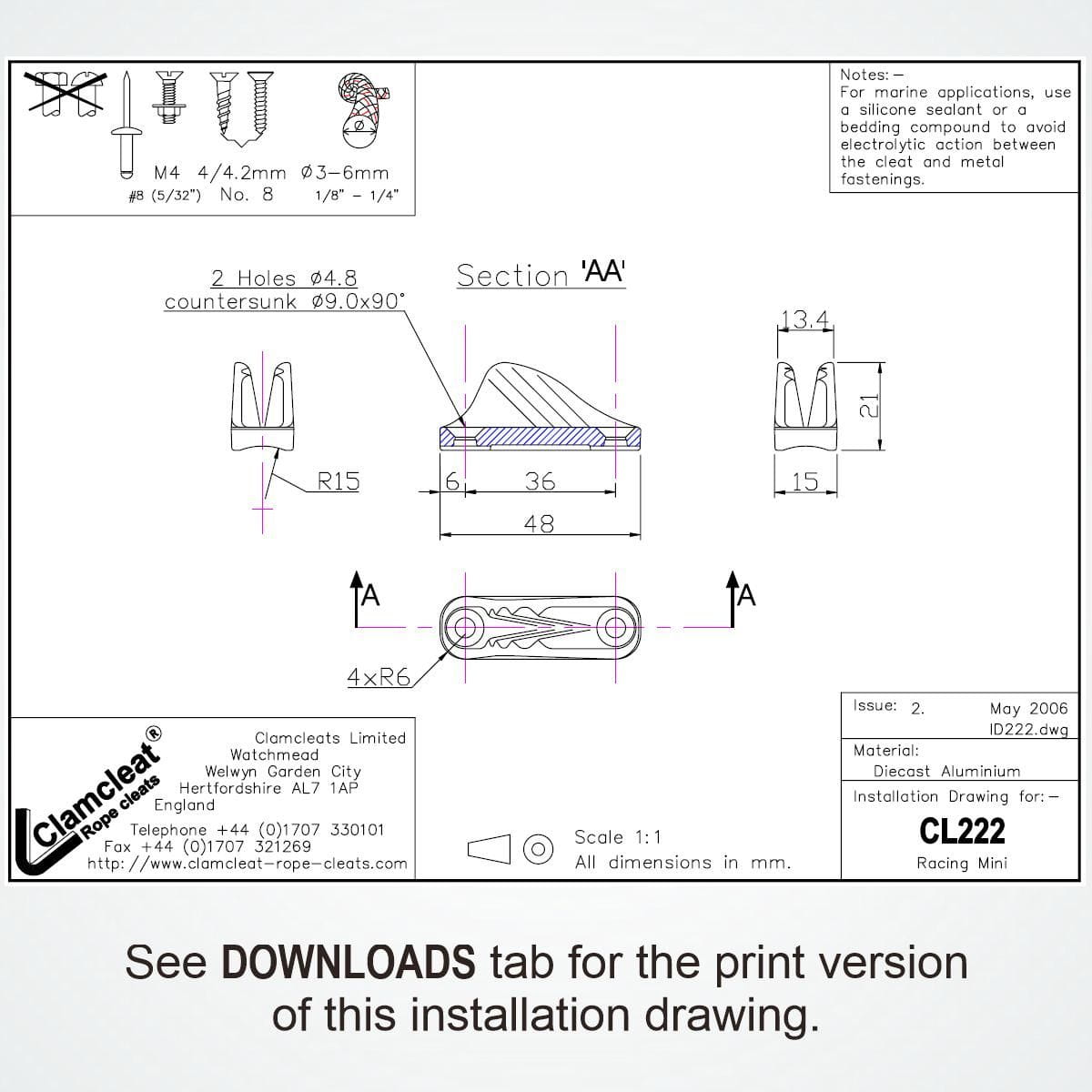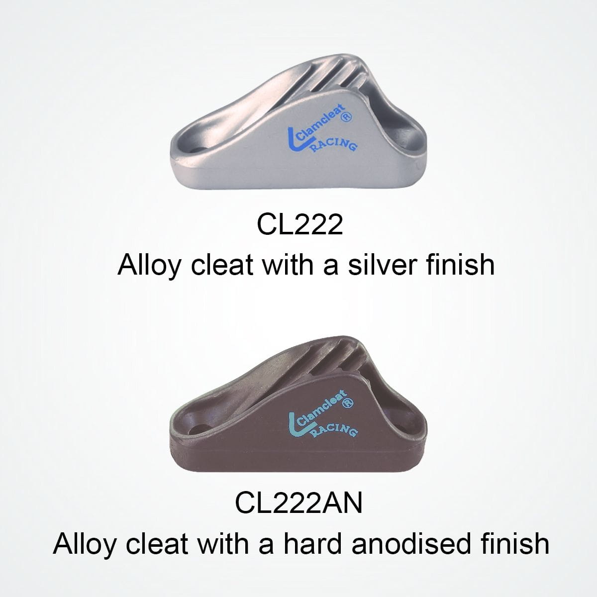 Clamcleat® CL222 to elegancka konstrukcja wykonana z aluminium z wykończeniem srebrnym lub anodowanym na twardo. Lina jest wkładana w zęby zacisku. Można knagę przymocować do wszystkich płaskich i zakrzywionych powierzchni za pomocą nitów, śrub z łbem stożkowym lub śrub. CL222 można również przyszyć, przynitować lub przykręcić do pasów lub tkanin (patrz zakładka pobierania).