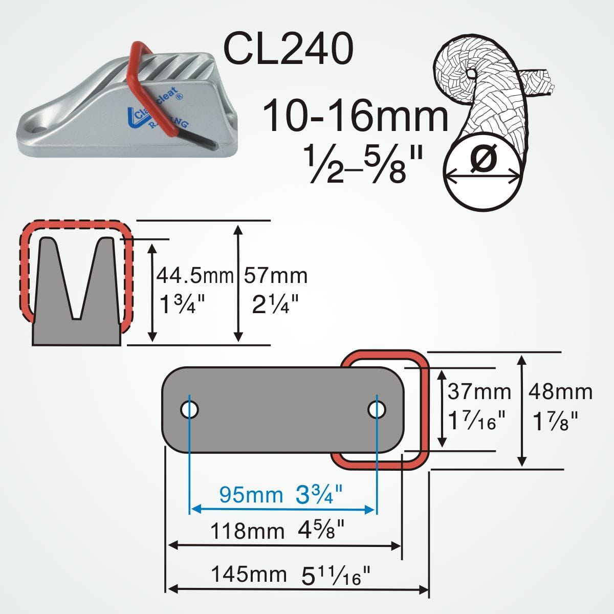 CL240 jest zmodyfikowaną wersją aluminiowego CL220, napis "CL240" jest wygrawerowany na spodzie zacisku. Można użyć rysunku montażowego CL220 do zaplanowania układu pokładu.