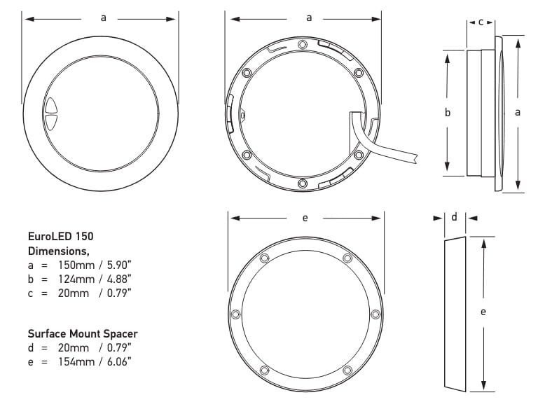 Lampy EuroLED150 to okrągłe lampy do montażu powierzchniowego o średnicy 150 mm. Lampa ta oferuje wbudowane sterowanie dotykowe, diody LED o barwie chłodnej bieli 5000 K oraz polerowaną obudowę ze stali nierdzewnej 316SS.