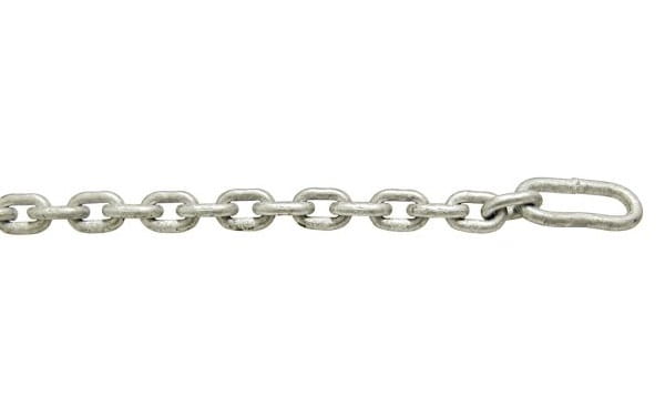 Łańcuch ocynkowany ogniowo zgodnie z DIN 766 z długimi ogniwami na końcach do mocowania kotwy.