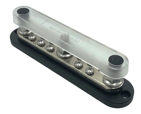 Listwa przyłączeniowa z izolowaną podstawą, zaciskami ze stali nierdzewnej i przezroczystą osłoną ochronną. 2 gwintowane kołki M6 + 12 śrub M5. 300A 48 V DC/300 V AC.