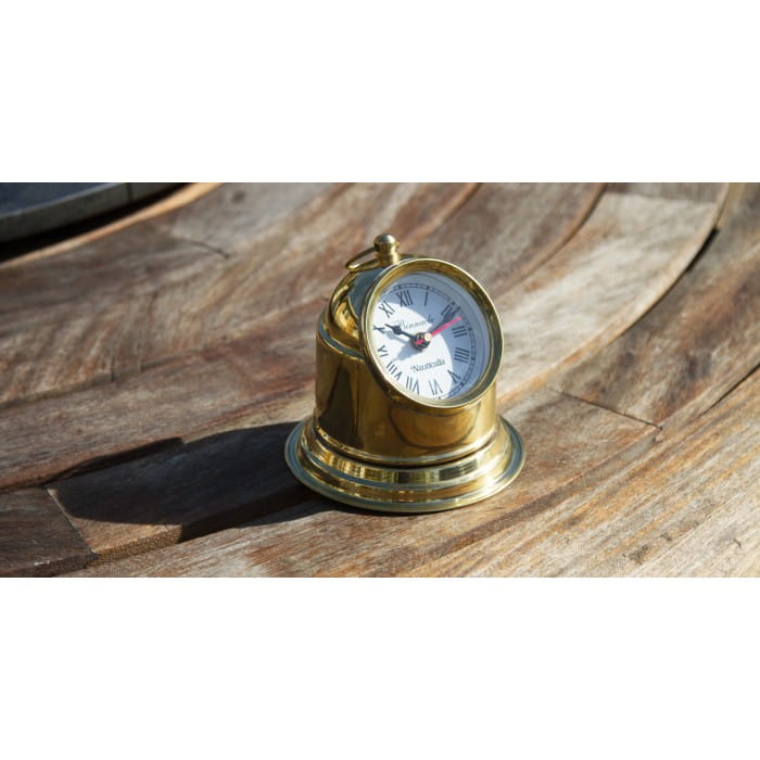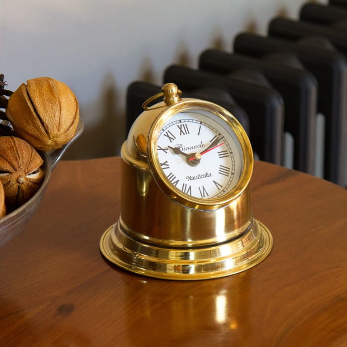 Zakrzywiona mosiężna obudowa przypomina tradycyjny binnacle statku, ale zamiast zwykłego kompasu z przegubem Cardana mieści zegar.