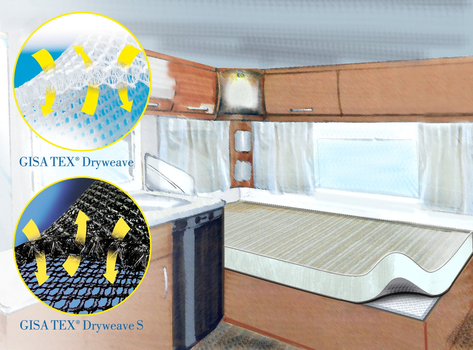 GISATEX® DRYWEAVE10 to wypróbowany i przetestowany podkład na materac i tapicerkę wykonany z poliestru 3mesh. Dzięki dużej liczbie i specjalnemu rozmieszczeniu nici poliestrowych powstaje struktura siatki. Podkład ten wentyluje poduszki, materace i powierzchnie do leżenia w łodziach i kamperach. GISATEX DRYWEAVE10 można prać.