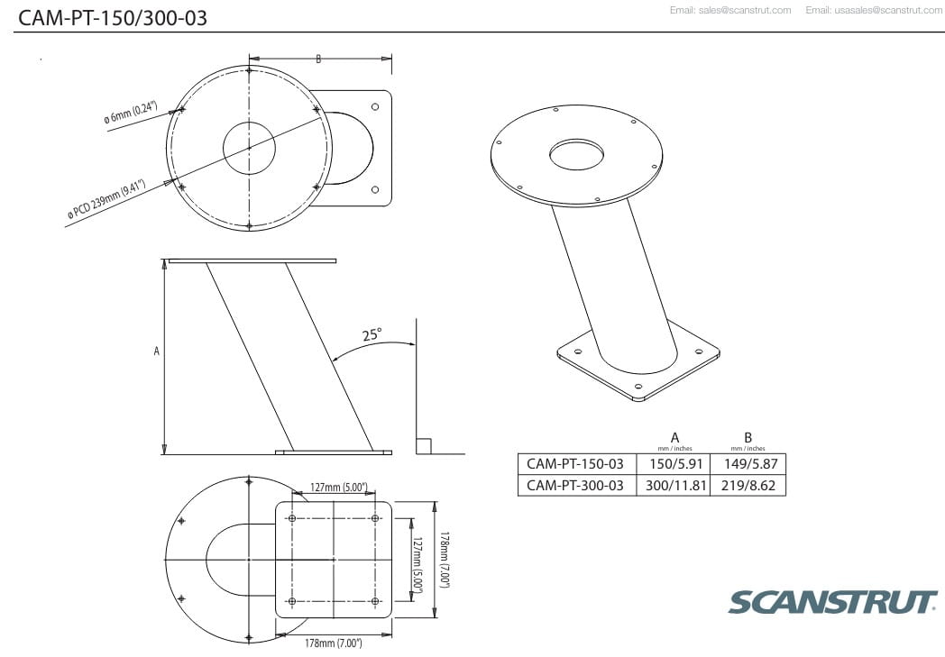 300 mm (11,8 cala) wysokości i fachowo zaprojektowana do montażu kamery na dachu kabiny, flybridge lub łuku radarowym jachtu motorowego, zaprojektowana specjalnie dla serii FLIR M300, zapewniając idealne dopasowanie do twojej kamery.