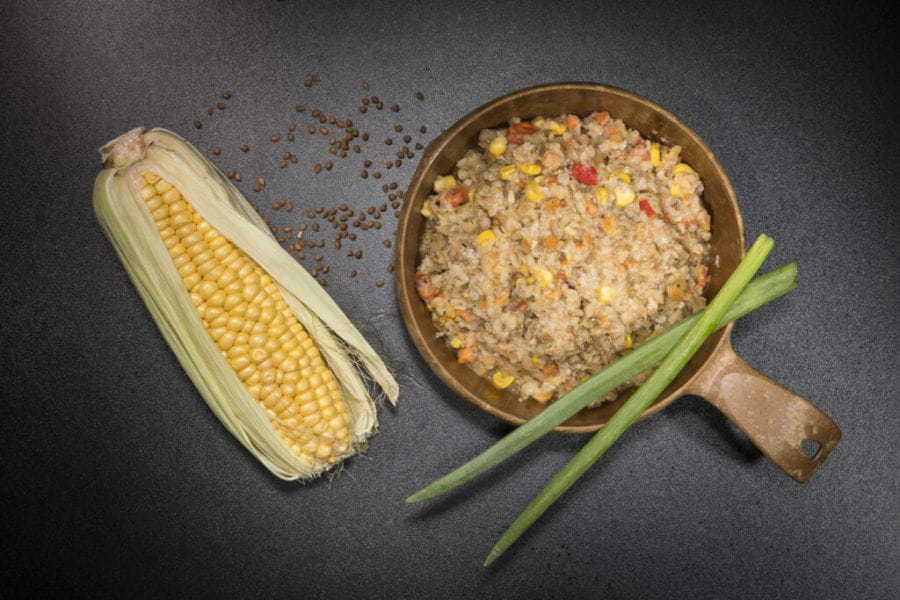 KASZA GRYCZANA Z INDYKIEM: kasza gryczana (47%), śmietana, udko z indyka (10%), marchew cebula, pieprz, kukurydza, olej rzepakowy, czosnek, przyprawy, zioła, sól