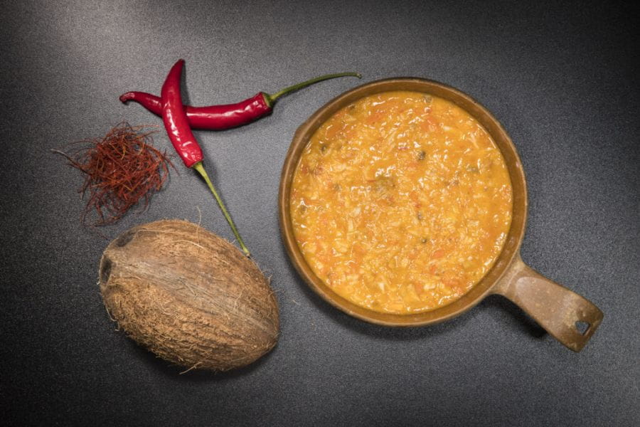 CURRY RYBNE: ryż, filet z morszczuka (20%), brokuły, bulion rybny, mleko kokosowe, cebula, olej rzepakowy, czosnek, kminek mielony, kolendra, pasta curry, sok z limonki