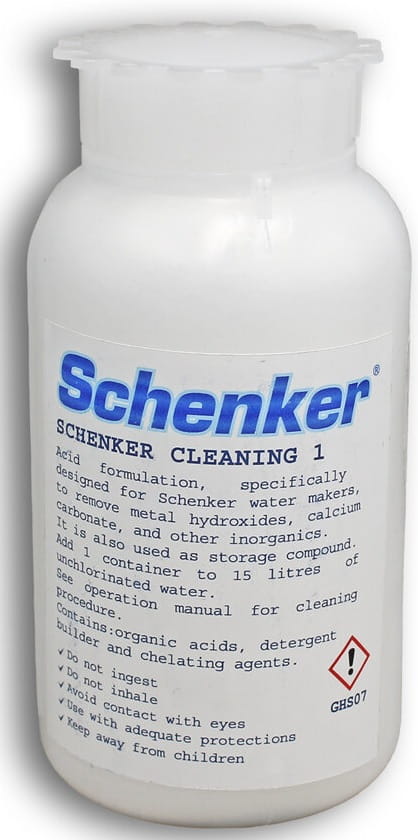 Produkt czyszczący SC1* (na bazie kwasu) jest stosowany w przypadku przestojów trwających od dwóch do trzech miesięcy (konserwacja systemu) lub w przypadku zabrudzonych membran, które można rozpoznać, gdy ciśnienie robocze jest zbyt wysokie. Proszek SC1 jest idealnym produktem do czyszczenia lub zimowania systemu Schenker. Ten rodzaj proszku może być stosowany do usuwania lub zapobiegania osadzaniu się kamienia i substancji nieorganicznych.