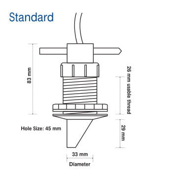 Przetwornik Standard ma 1 calowy gwint. Większość łodzi o płaskim dnie kadłuba może używać przetwornika Standard.