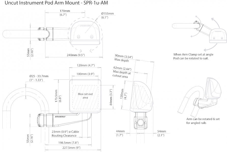 Arm Pod firmy Scanstrut umożliwia instalację małych ekranów, przełączników, kontrolerów, liczników łańcuchów i innych elementów na dowolnym standardowym lub zakrzywionym relingu. Wodoodporne wewnętrzne prowadzenie kabli pozwala bezproblemowo poprowadzić kable przez spód poda, obrabiany aluminiowy zacisk i do relingu.