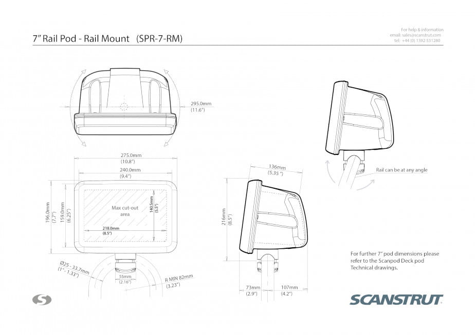 Rail Pod firmy Scanstrut umożliwia instalację instrumentu na dowolnym standardowym lub zakrzywionym relingu. Wodoodporne wewnętrzne prowadzenie kabli pozwala bezproblemowo poprowadzić kable przez spód poda, obrabiany aluminiowy zacisk i do relingu. Daje to najczystszy i najbardziej przyjazny dla użytkownika sposób montażu wskaźnika MFD tam, gdzie jest najbardziej potrzebny.