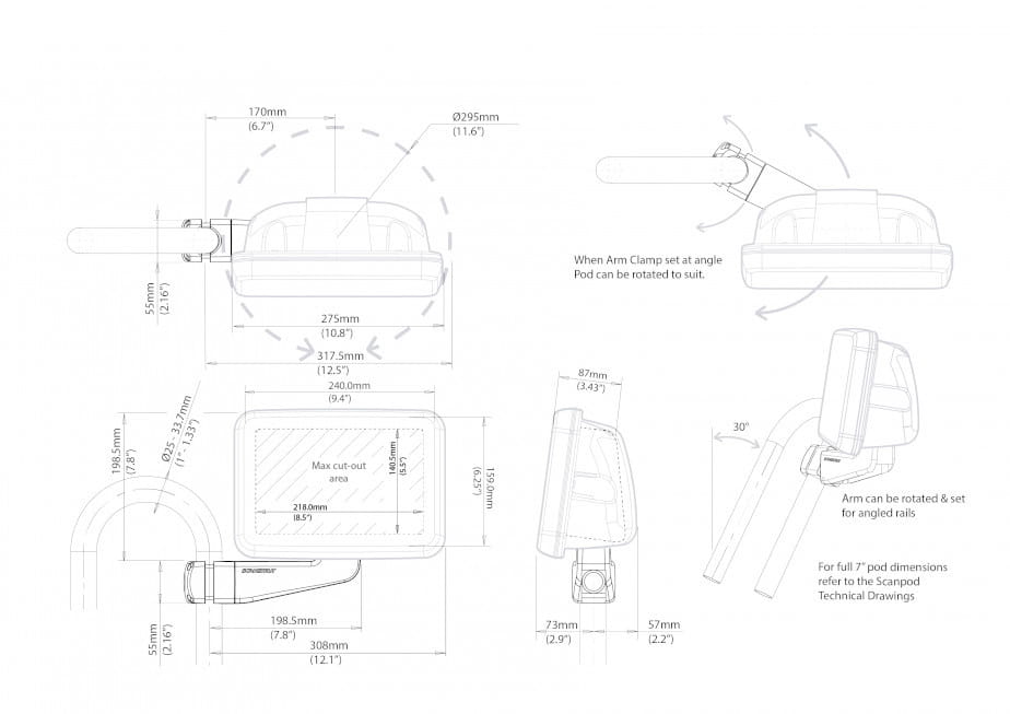 Uchwyty ramienne firmy Scanstrut umożliwiają zainstalowanie wskaźnika wielofunkcyjnego na dowolnym standardowym lub zakrzywionym relingu. Wodoodporne wewnętrzne prowadzenie kabli pozwala bezproblemowo poprowadzić kable przez spód poda, obrabiany aluminiowy zacisk i do relingu. Daje to najczystszy i najbardziej przyjazny dla użytkownika sposób montażu wskaźnika MFD tam, gdzie jest najbardziej potrzebny.