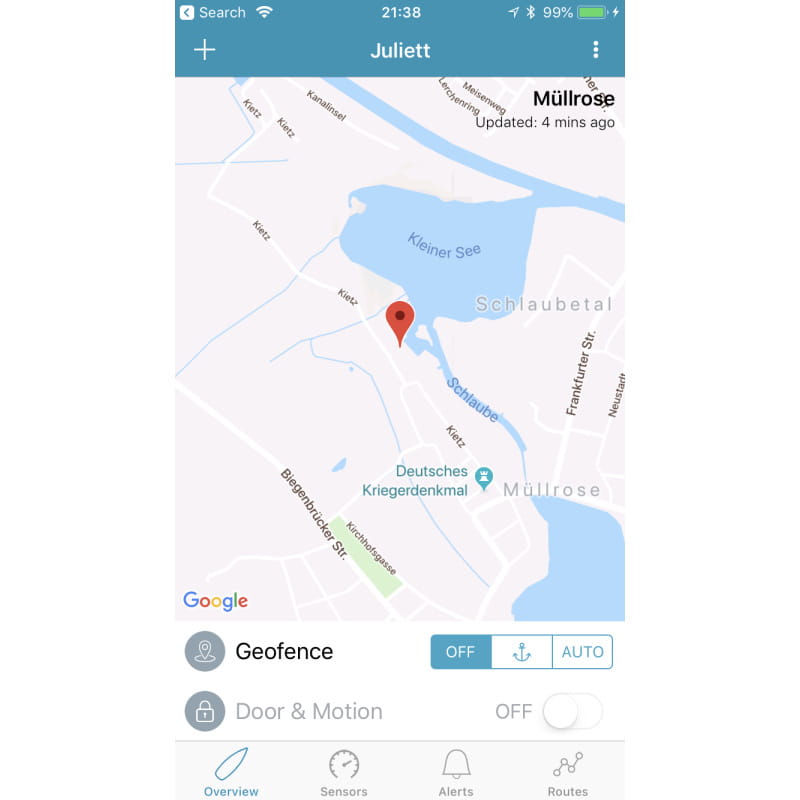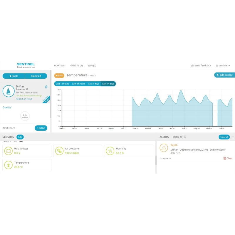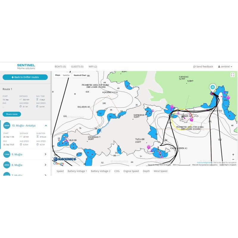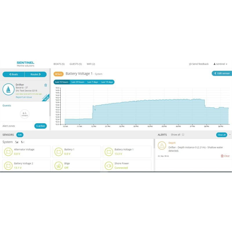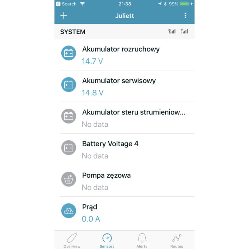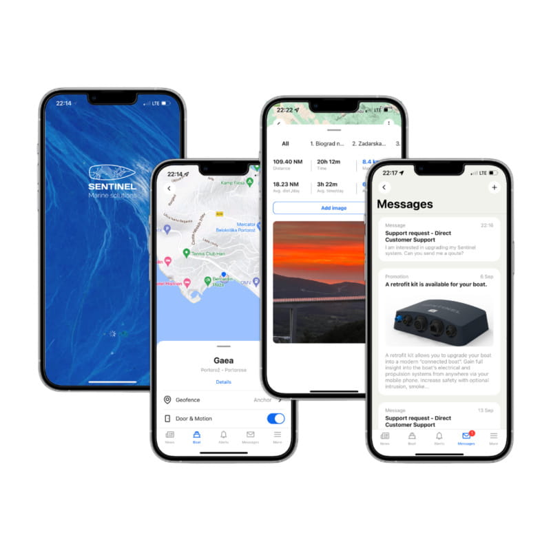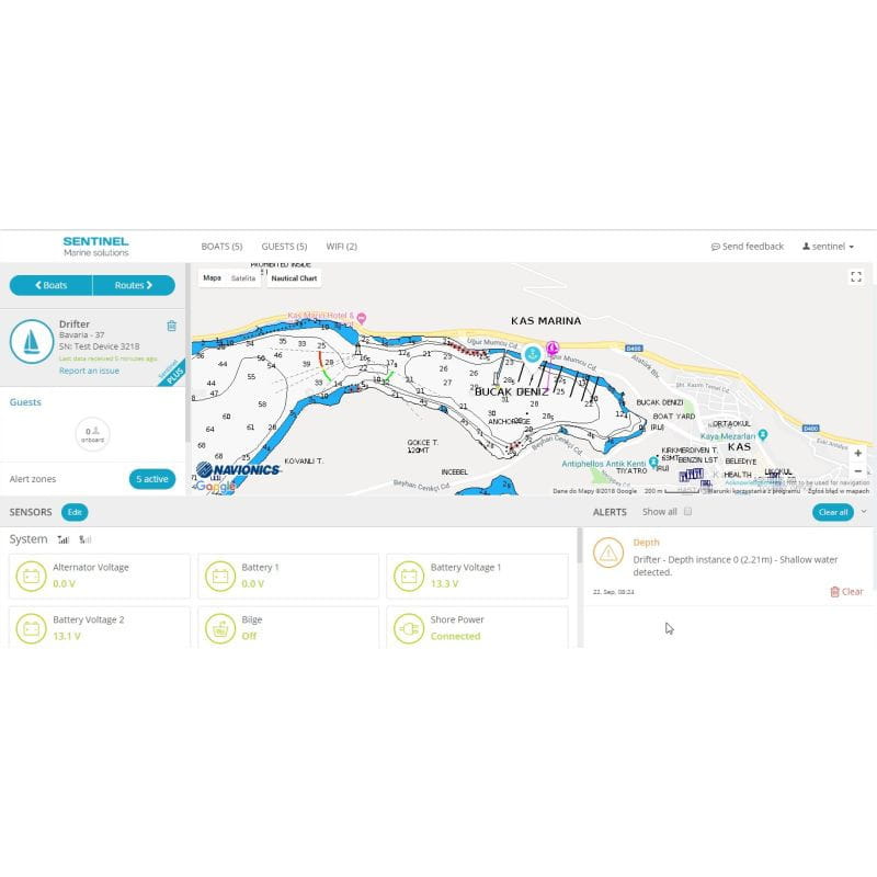 Możliwe jest definiowanie alarmów wyzwalających powiadomienia, na przykład niskiego napięcia akumulatora lub załączenia pompy zęzowej. Aplikacja wyświetla trasę jachtu, możliwe jest włączenie alarmu kotwicznego.