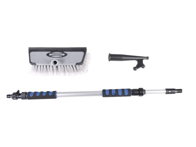 Zestaw składa się z teleskopowej rączki wykonanej z anodowanego aluminium z gumowanymi rączkami, miękkiej szczotki oraz przykręcanego haka bosakowego.