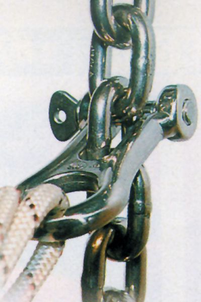 Szekla łańcuchowa Kong służy do łatwego mocowania amortyzatora lub liny zabezpieczającej do łańcucha kotwicy.