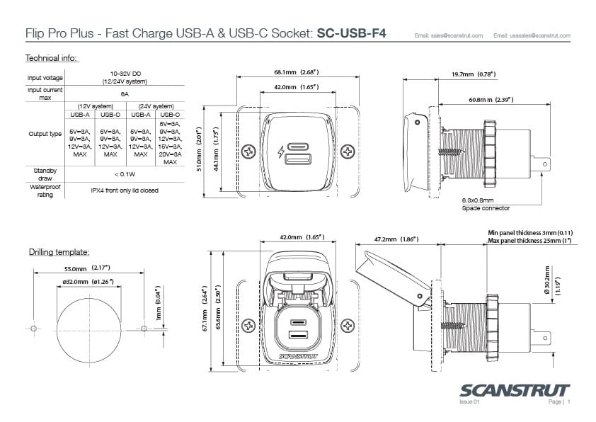 Wycięcie instalacyjne pasuje do gniazd Scanstrut Flip Pro Max, Duo i Multi USB (32 mm (1 1/8"), zapewniając jednolity wygląd w całej gamie. Teraz możesz nadążać za większym poborem mocy przez nowoczesne urządzenia elektroniczne jednocześnie utrzymując wysokiej jakości, uniwersalne ładowarki USB na całym jachcie.