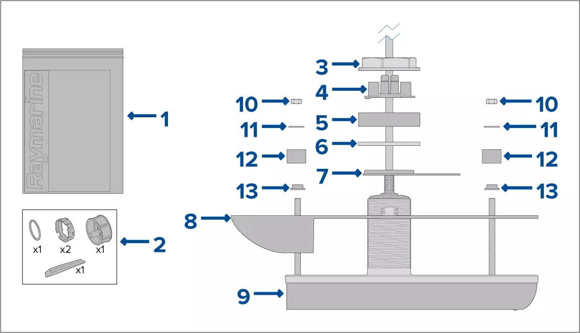 2. Zestaw kołnierza blokującego (do złącza kabla przetwornika), składający się z: 2 x pierścienie dzielone (zawiera część zapasową), 1 x O-ring, 1 x kołnierz blokujący, 1 x narzędzie do montażu pierścienia dzielonego