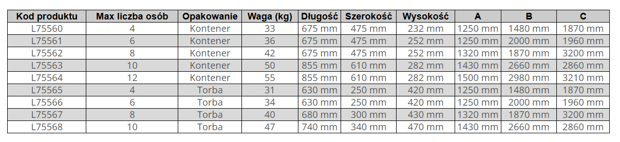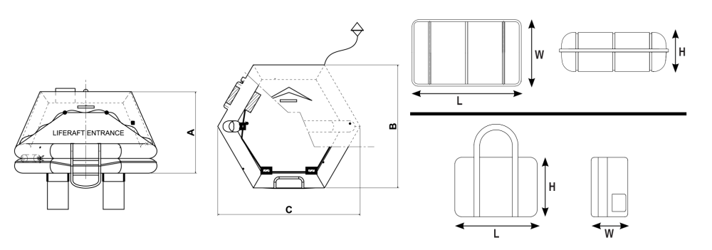 Wszystkie wymiary i waga tratwy ratunkowej mogą się nieznacznie różnić (±3 cm dla wymiarów, ±5% dla wagi).